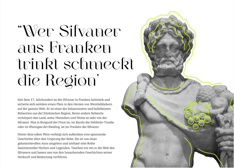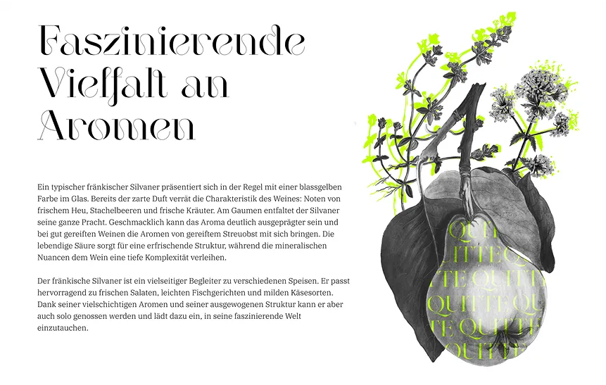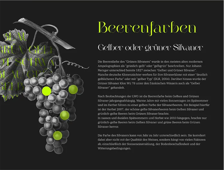 The Silvaner grape is not only a grape variety, but also a symbol of Franconian wine culture. It shapes the wine landscape of Franconia and is closely linked to the history and tradition of the region. In the interactive web story "Silvaner aus Franken", users have the opportunity to immerse themselves in the fascinating world of Silvaner and learn more about its history, genetic diversity and unique character. Through interactive elements and informative content, they can discover the versatility of this grape variety and expand their knowledge about this Franconian classic.